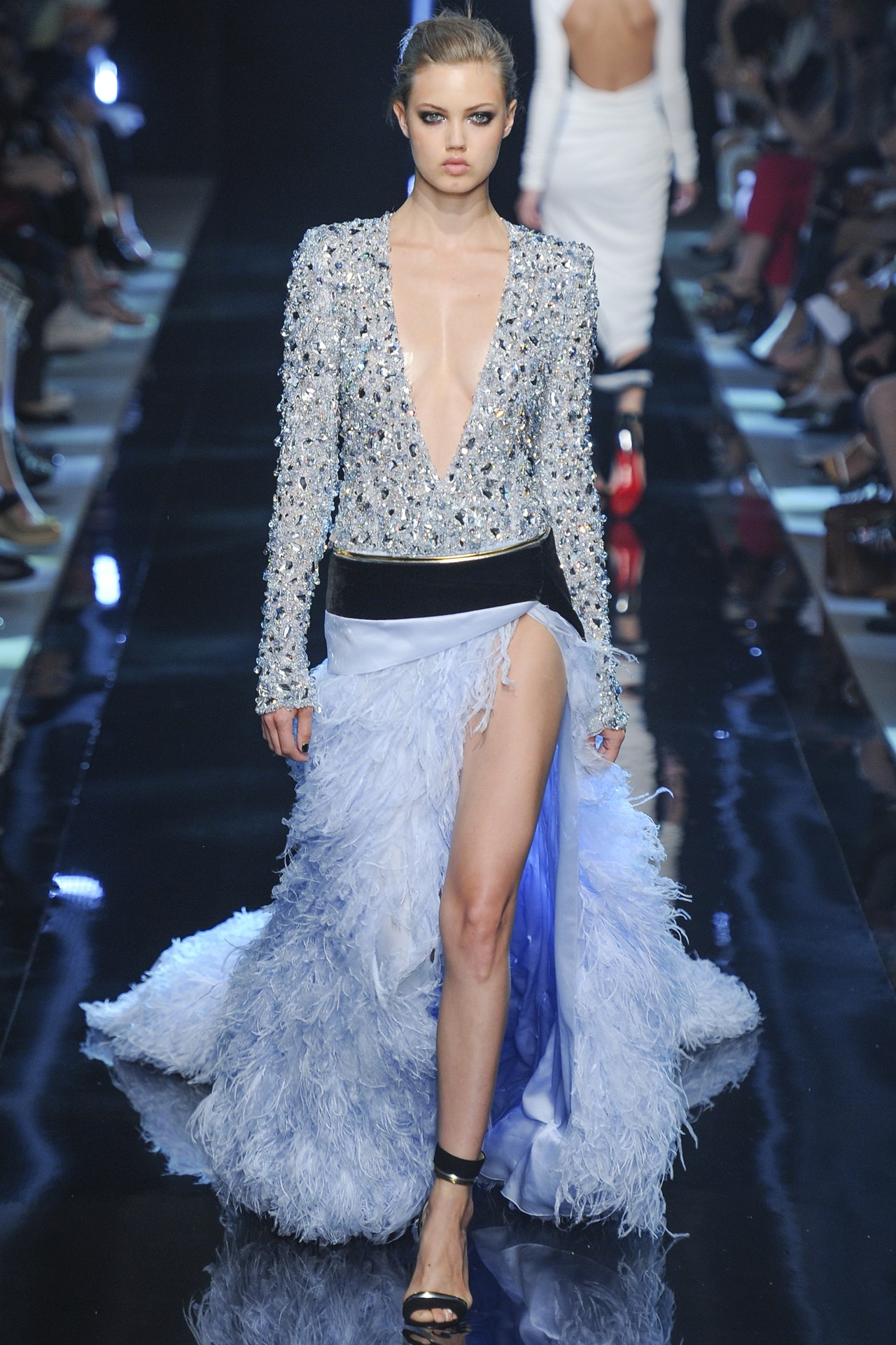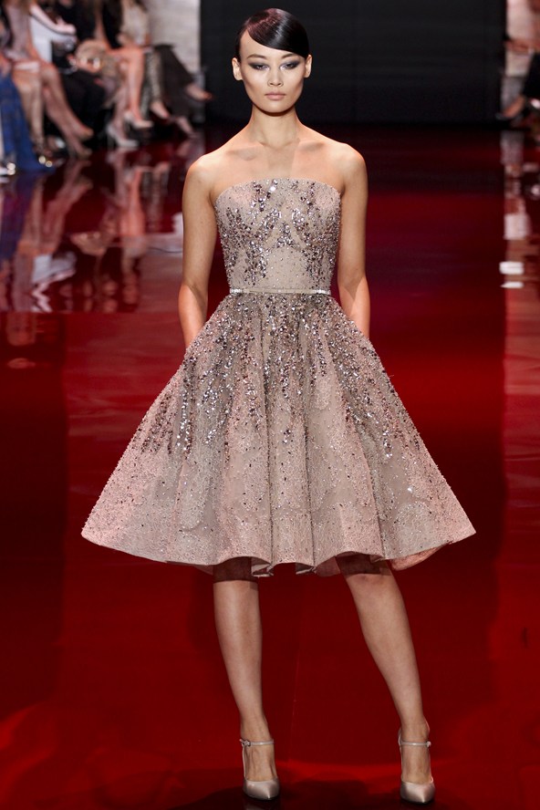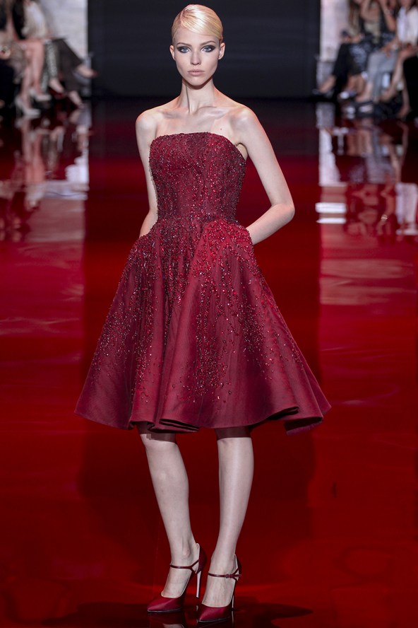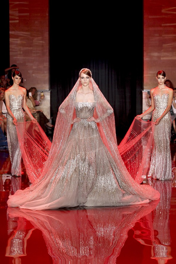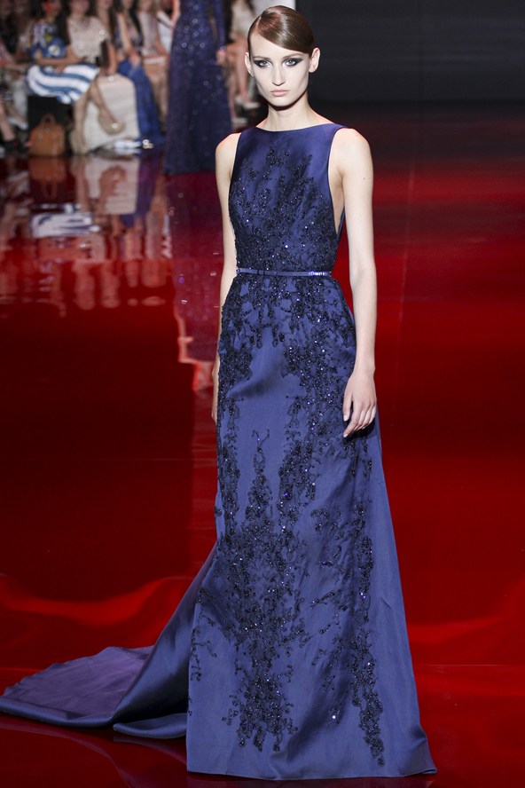 طغت الازياء الملكية على مجموعة Elie Saab بألوان طغى عليها الأحمر والكحلي والأخضر والفضي، تزيّنها أحجار بألوان الياقوت والزمرد.