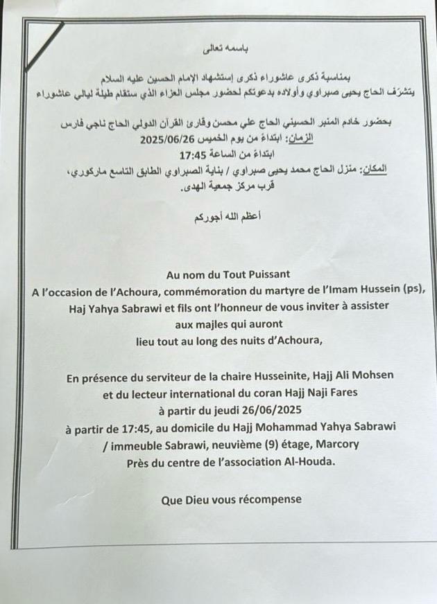 كعادته في كل عام يحيي الحاج يحيى صبراوي في دراته في أبيدجان ذكرى عاشوراء بمجالس عزاء يومية في دارته في ماركوري في أبيدجان.