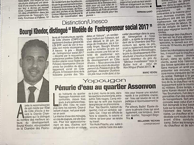 في خطوة تعبّر عن مدى شفافية عمله ودوره في عملية التطوير الإعماري والسكني في الكوت ديفوار، منحت منظمة الأونيسكة ميداليتها للعام 2017، لنائب رئيس نقابة المقاولين اللبناني خضر البرجي. نظراً لدور شركته الفعال والإيجابي في هذا المجال في احتفال رسمي حضره كبار المسؤولين في المنظمة الدولية وفي الجهات المسؤولة والمعنية في مجال السكن والإعمار.