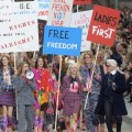 ولوحت عارضات يحملن مكبرات الصوت بلافتات كتب عليها “حقوق المرأة على ما يرام” و”يمكننا أن نباري الرجال” ورافقهن في ذلك المصمم لاغرفيلد الذي كان يرتدي نظارة شمسية وأمسك في يده هاتف “آيفون”.