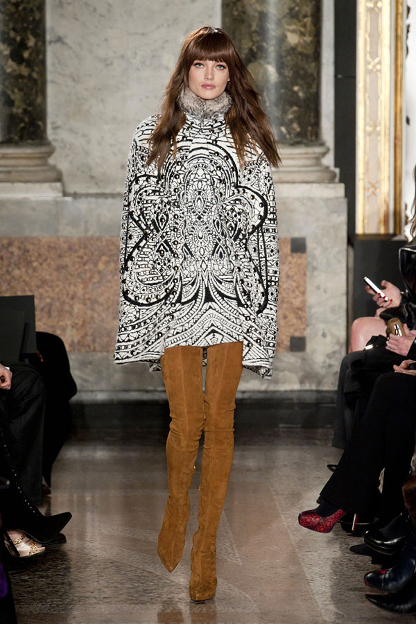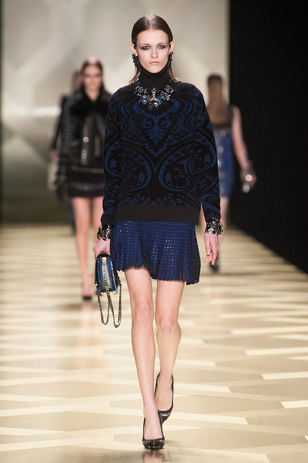 قدّمت دار روبيرتو كافالي مجموعتها لخريف وشتاء 2013، سيطر عليها الأبيض والأسود، وارتدت العارضات فساتين منسدلة ذات قصة على الخصر من الحرير الأسود المطعم بخيوط براقة لإعطاء مظهر كلاسيكي. أما الأقمشة المطبّعة فلم تغب عن هذه المجموعة وإن كان حضورها خجولاً بعض الشيء إلا أنّها ظهرت في تصاميم كافالي لتؤكّد أنّها الموضة الأبرز 2013.
