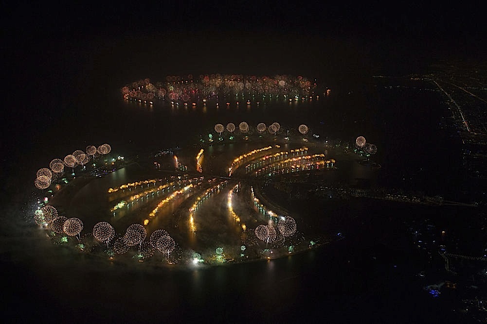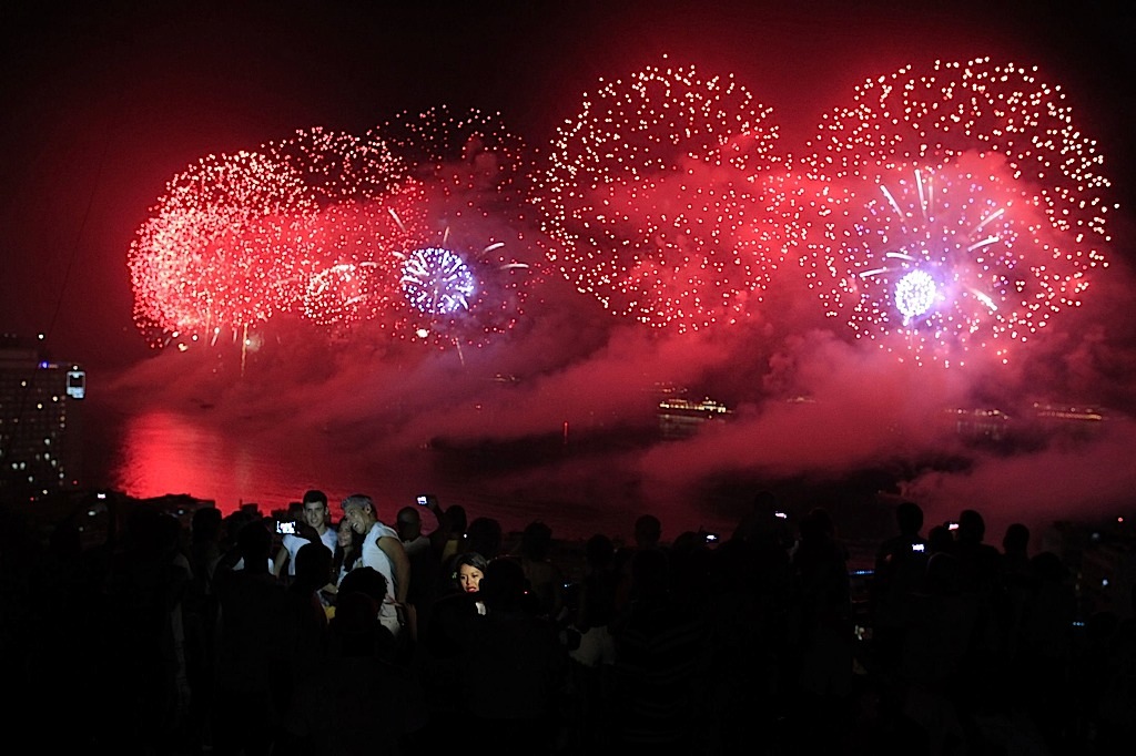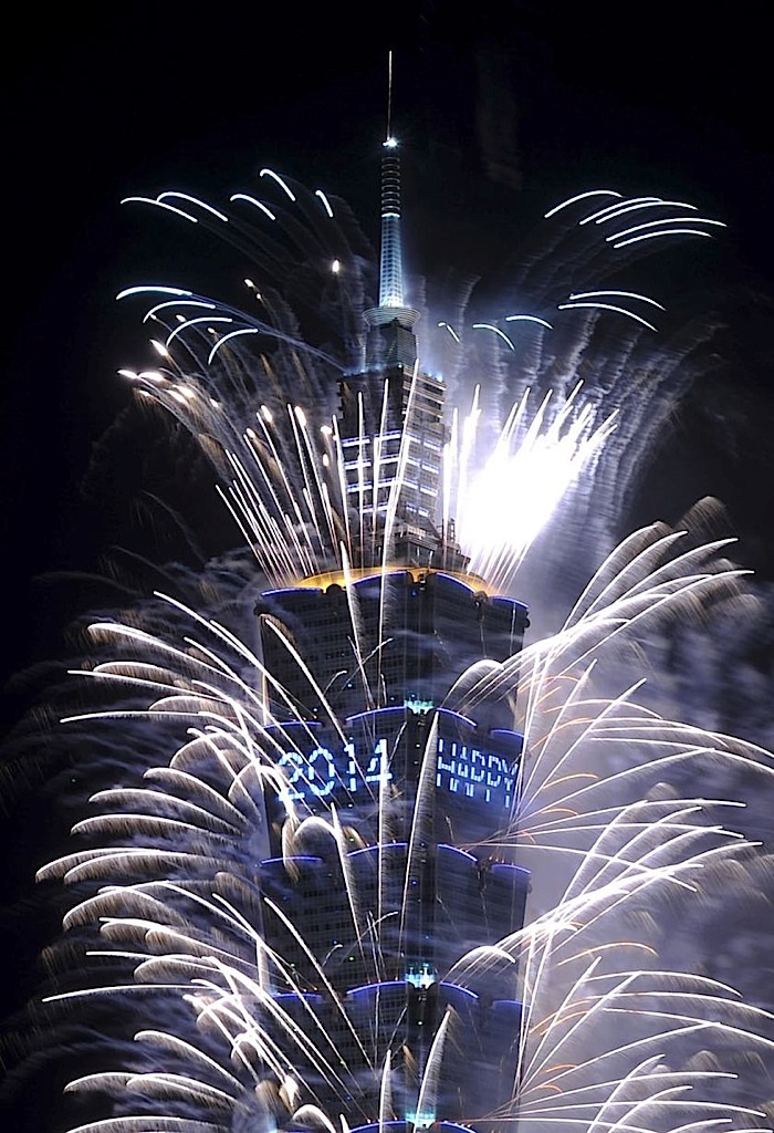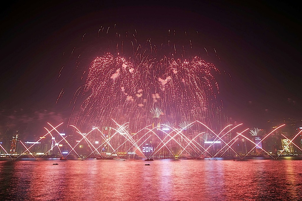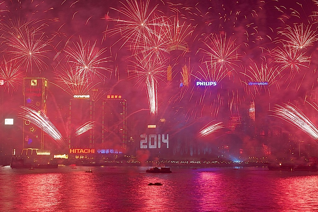 استقبل المحتفلون من سيدني الى دبي عام 2014 بعروض باذخة للالعاب النارية واحتفلت لندن برش سحب من رذاذ بنكهة الفواكه قبيل الالعاب النارية واحتفالات هائلة في الهواء الطلق في شياغو وسان فرانسيسكو.