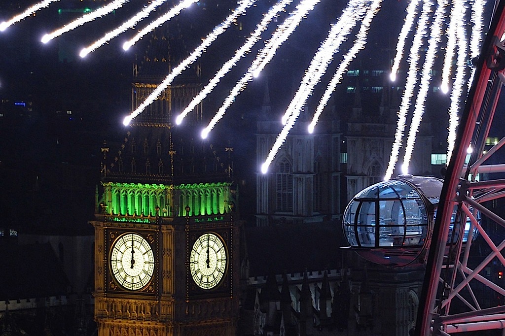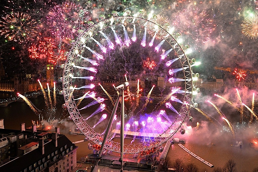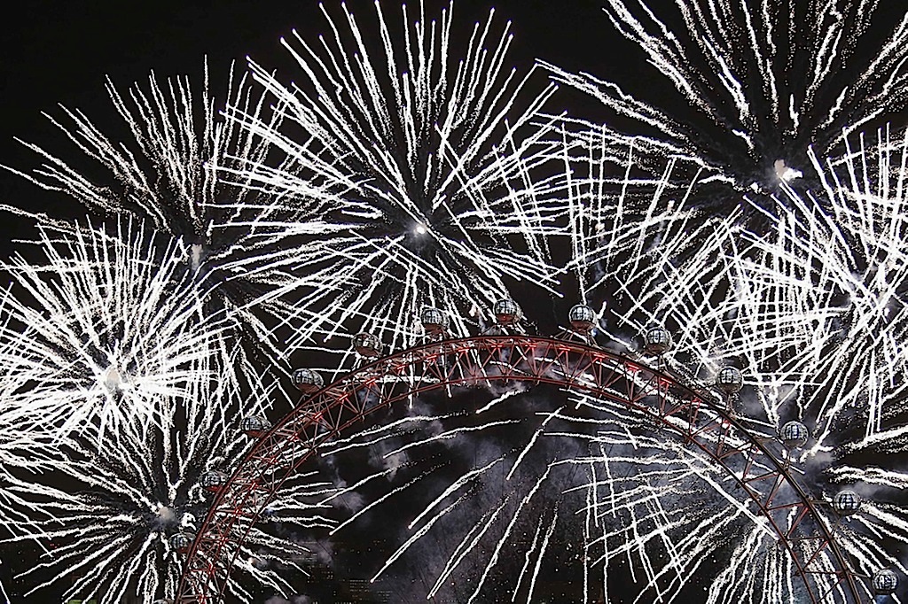 وفي لندن هبطت على الناس سحب من رذاذ بطعم الموز والفراولة في الوقت الذي لمعت فيه الالعاب في النارية السماء فوق نهر التيمز وبرج بيج بن وغيره من المعالم.