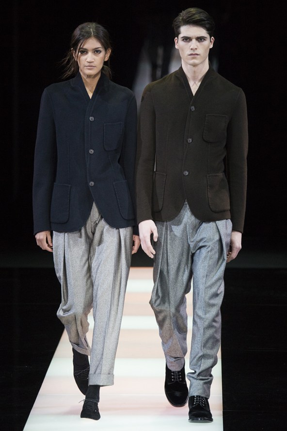 في حين سيطر اللون الأسود على مجموعة «جورجيو أرماني» وشمل البزات والسترات والبناطيل والمعاطف والأوشحة ونظارات الشمس والقبعات والحقائب، إذ تضمن العرض سترات سوداء ذات خطوط بيضاء رفيعة مع بناطيل رمادية، في ما كان من ضمن التنويعات الأخرى بناطيل سوداء فوقها سترات مغلقة ذات لون أخضر قاتم.