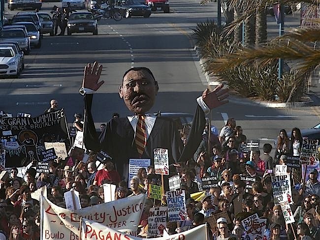 وفي تظاهرة قبيل الفجر في مدينة أوكلاند بولاية كاليفورنيا تجمع نحو 40 شخصا على عتبة منزل عمدة المدينة ليبي شاف مطالبين بتطبيق عقوبات أقسى على رجال الشرطة الذين يستخدمون العنف ضد المدنيين.