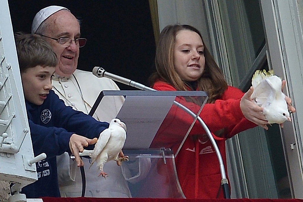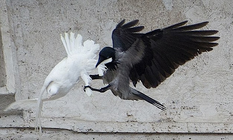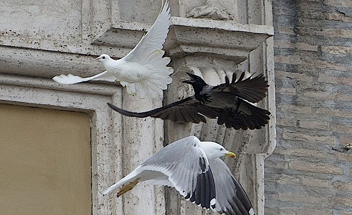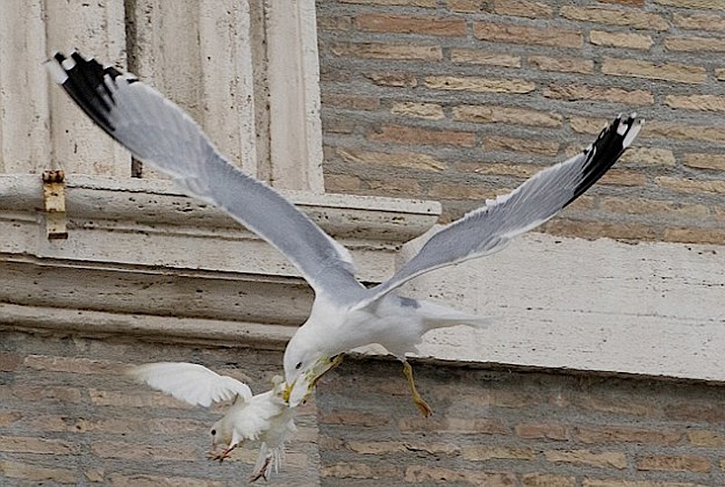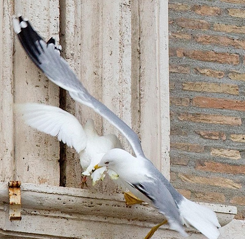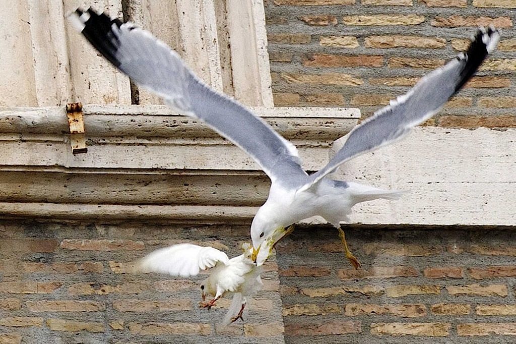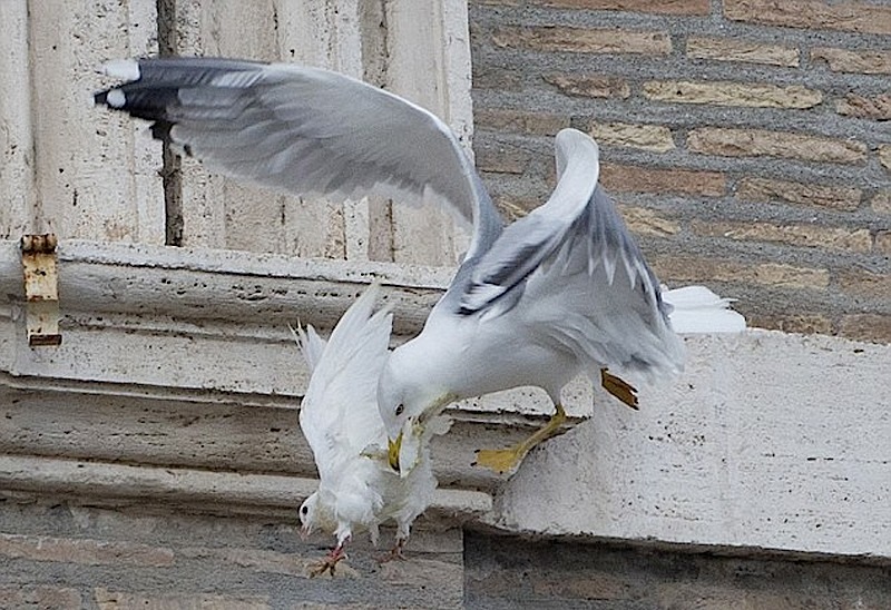 وقعت حمامتان اطلقهما طفلان من شرفة البابا فرنسيس في الفاتيكان كتعبير عن السلام فريسة غراب وطائر نورس على مرأى عشرات الآلاف من الزائرين.
