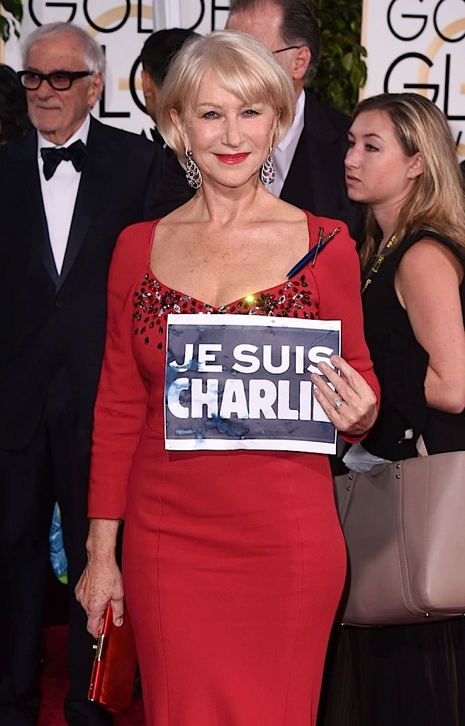 وقال كلوني في إشارة إلى المسيرة الضخمة التي شهدتها باريس يوم الأحد “لقد شاركوا في مسيرة دعما لفكرة اننا لن نسير خائفين. أنا شارلي.” ووضعت هيلين ميرين قلما على فستانها الاحمر وتحدث جاريد ليتو بالفرنسية دعما لرسامي الكاريكاتير الذي قتلوا في الهجوم على مقر الصحيفة الفرنسية الساخرة.