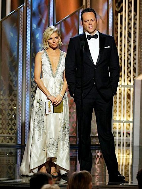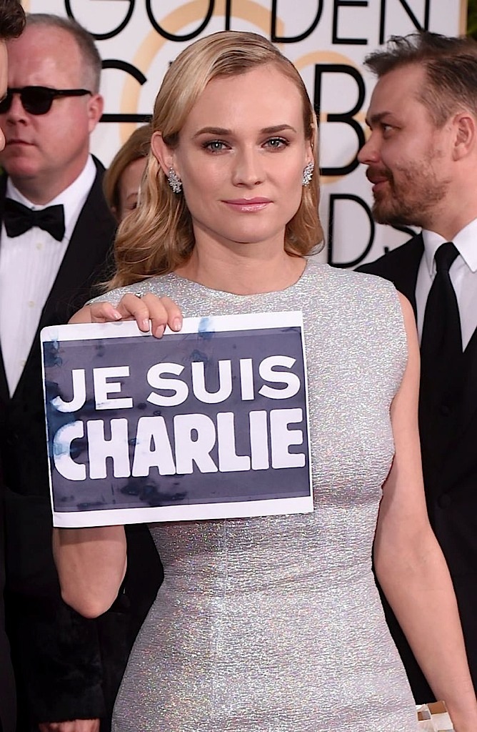 وأصبح الحفل الذي تنظمه جمعية الصحافة الأجنبية في هوليوود منصة لدعم حرية التعبير عقب الهجوم على صحيفة شارلي ابدو الفرنسية. وظهر الممثل والمخرج جورج كلوني وهو يضع على بدلته شارة عليها عبارة “أنا شارلي.”