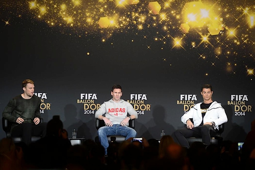 واحتل ميسي ورونالدو والهولندي أرين روبن دفة الهجوم، لتكتمل بذلك تشكيلة النجوم لأفضل 11 لاعبا في 2014.