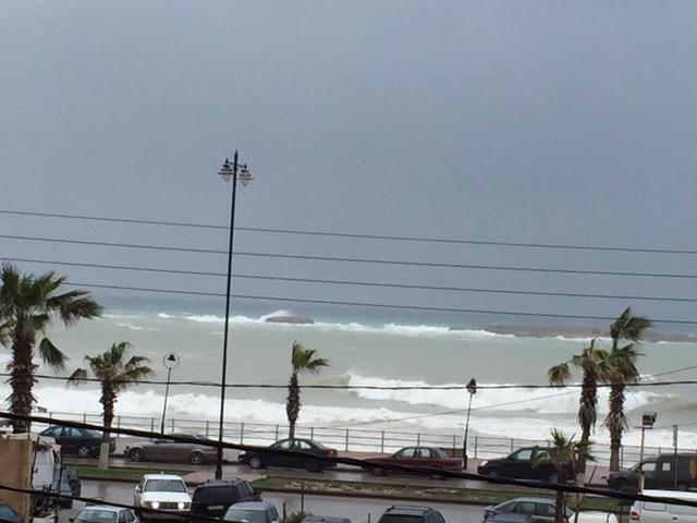 وغمرت مياه الامطار الغزيرة التي تساقطت مواقف السيارات عند الشاطئ الجنوبي اضافة الى وصول مياه الامواج إليه، بسبب ارتفاعها الذي بلغ 6 امتار.وبلغت سرعة الرياح 80 كيلومترا في الساعة، مترافقة مع امطار غزيرة. وادت سرعة الرياح الى اقتلاع الاشجار وتطاير بعض اللوحات الاعلانية المرفوعة على جوانب الطرقات.