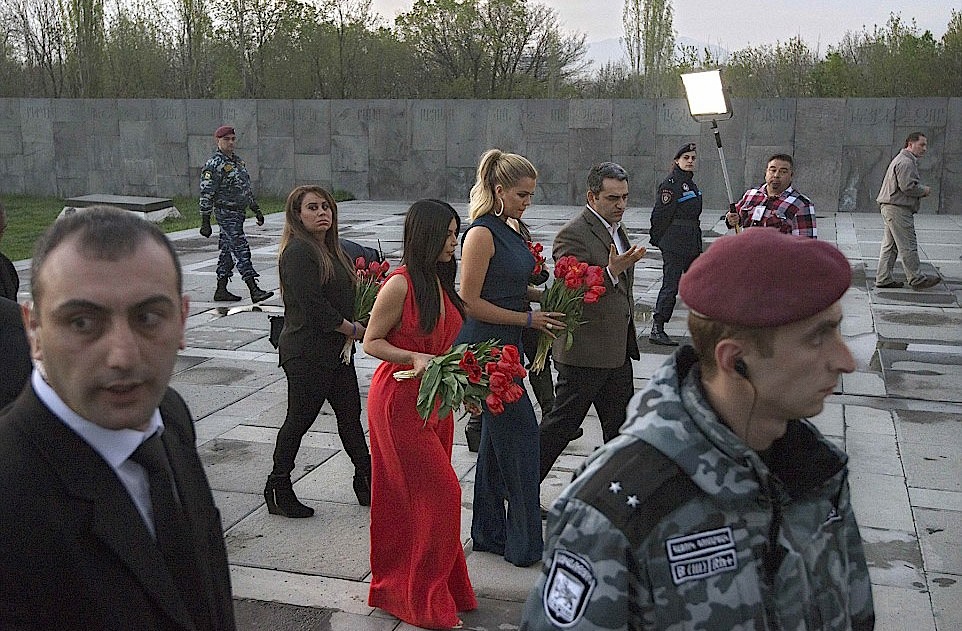 وضعت نجمة تلفزيون الواقع كيم كردشيان التي تزور أرمينيا موطن أسلافها الزهور الجمعة على نصب تذكاري لضحايا عمليات قتل جماعي للأرمن في العام 1915 على يد جنود عثمانيين. ووضعت كردشيان التي كانت ترتدي ثوبا أحمر اللون طويلا زهور التوليب قرب النصب التذكاري على مشارف العاصمة يريفان.