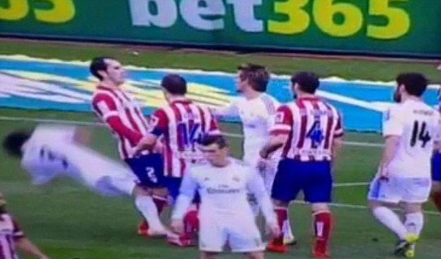 وبالعودة الى بيبي الذي حاول ريال مدريد التخفيف عن عدائيته على أرض الملعب منذ العام الفائت فقد قام بما يمكن وصفه أسواء تمثيل على الاطلاق. اذ حشر رأسه على مؤخرة رأس لاعب اتليتيكو ديغو غودين وما ان تحرك دييغو حتى قام بيبي بالشقوط ارضا وطبعا مع ما يصاحب السقوط من مؤثرات خاصة. لكن لحسن الحظ كان حكم المباراة يقف قريبا جدا منه ولم تمر عليه تلك التمثيلية القصيرة.