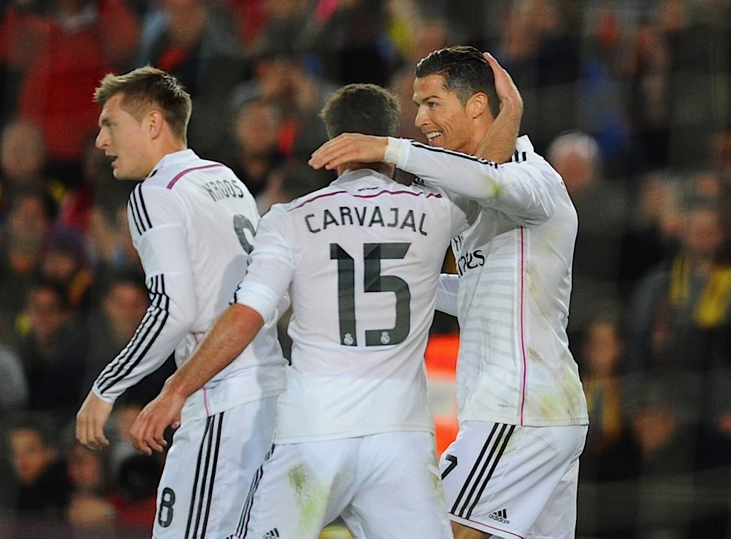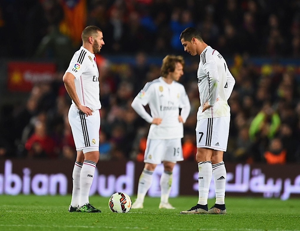 وعاد توني كروس لقيادة وسط ريال بعد اراحته في الفوز على ليفانتي الاسبوع الماضي. وبدأ ريال جيدا وتفوق على برشلونة في وسط الملعب ومن واحدة من هجماته السريعة مرر بنزيمة كرة عرضية إلى رونالدو الذي ارتطمت تسديدته بباطن القدم من زاوية صعبة بالعارضة.