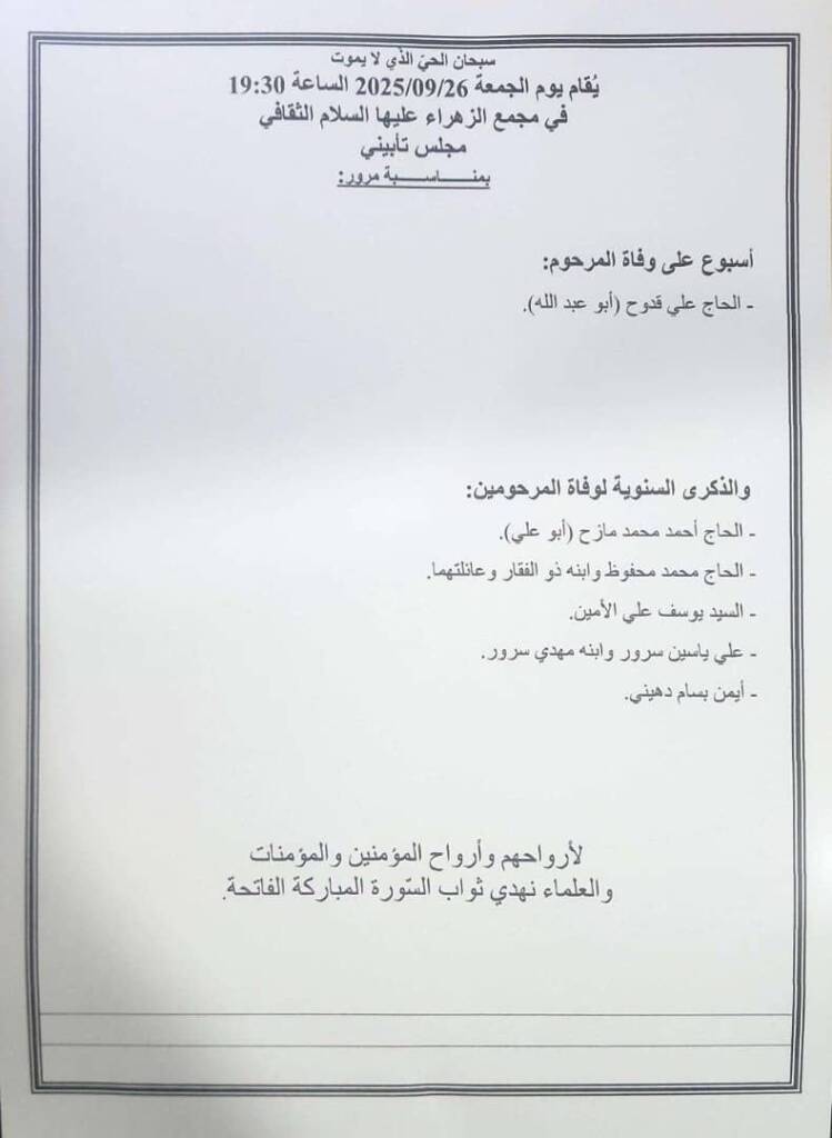 وفي ختام المجلس، تقبّل الشيخ شعلان وأقارب أصحاب الذكرى التعازي من المشاركين.
