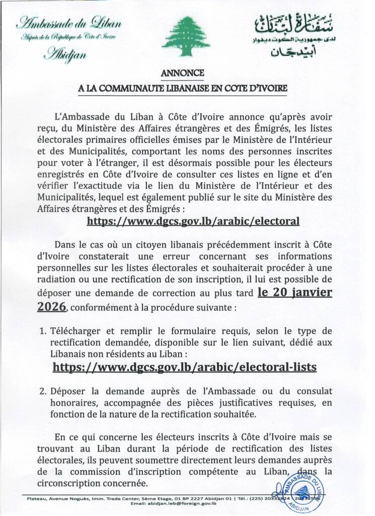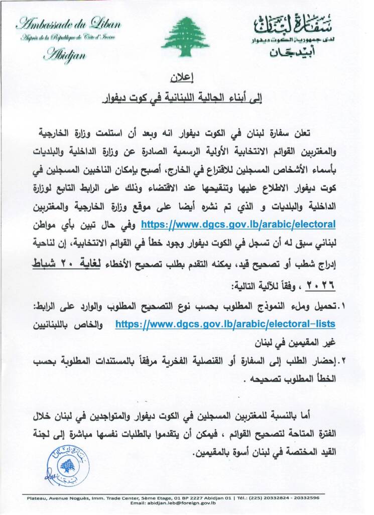 أعلنت سفارة لبنان في كوت ديفوار أن القوائم الانتخابية الأولية الخاصة بأبناء الجالية اللبنانية في البلاد أصبحت متاحة للاطلاع والتنقيح.