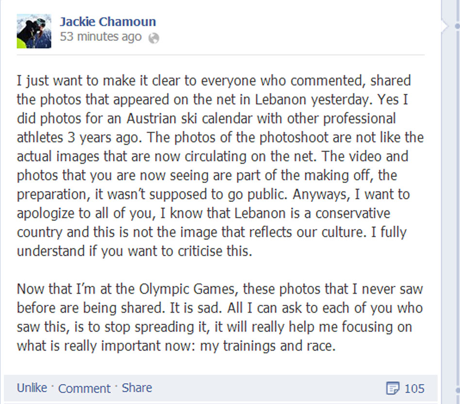 انشغلت وسائل الإعلام اللبنانية بمتابعة الألعاب الأولمبية الشتوية، لكن من زاوية أخرى بعد ظهور تقارير أشارت الى ان المتزلجة التي تمثل البلاد في «سوتشي» شاركت في جلسة تصوير ظهرت فيها شبه عارية.
