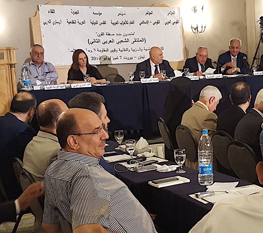 تحت عنوان “متحدون ضد صفقة القرن” عقدت ست هيئات عربية في العاصمة اللبنانية بيروت مؤتمراً عاماً في ملتقى شعبي عربي بدعوة من المؤتمرات الثلاث القومي العربي، القومي الاسلامي، الاحزاب العربية، مؤسسة القدس الدولية، اللقاء اليساري العربي ـ الجبهة العربية التقدمية، للتأكيد على رفض صفقة القرن وكل مخرجاتها وتفريعاتها.
