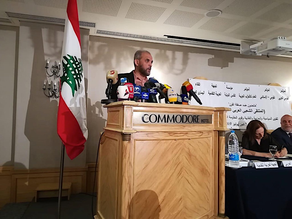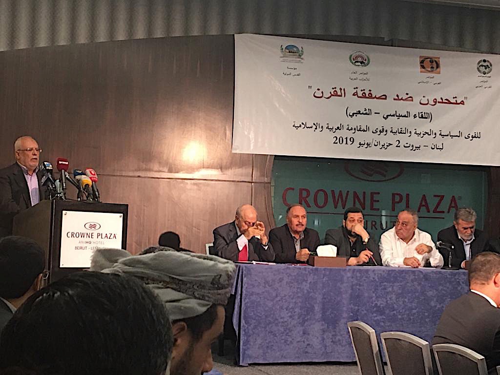حت عنوان “متحدون ضد صفقة القرن” عقدت ست هيئات عربية في العاصمة اللبنانية بيروت اليوم مؤتمراً عاماً في ملتقى شعبي عربي بدعوة من المؤتمرات الثلاث القومي العربي، القومي الاسلامي، الاحزاب العربية، مؤسسة القدس الدولية، اللقاء اليساري العربي ـ الجبهة العربية التقدمية، للتأكيد على رفض صفقة القرن وكل مخرجاتها وتفريعاتها.