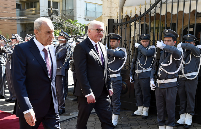 وكان بري قد استقبل الرئيس الألماني عند مدخل قصر عين التينة حيث عزفت موسيقى قوى الأمن الداخلي النشيدين اللبناني والألماني وقدمت له ثلة من شرطة المجلس التحية.