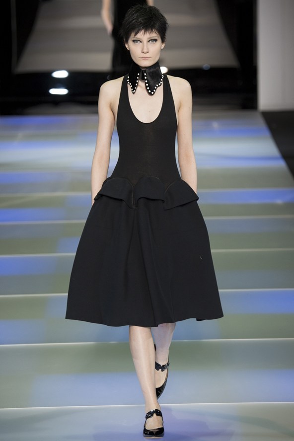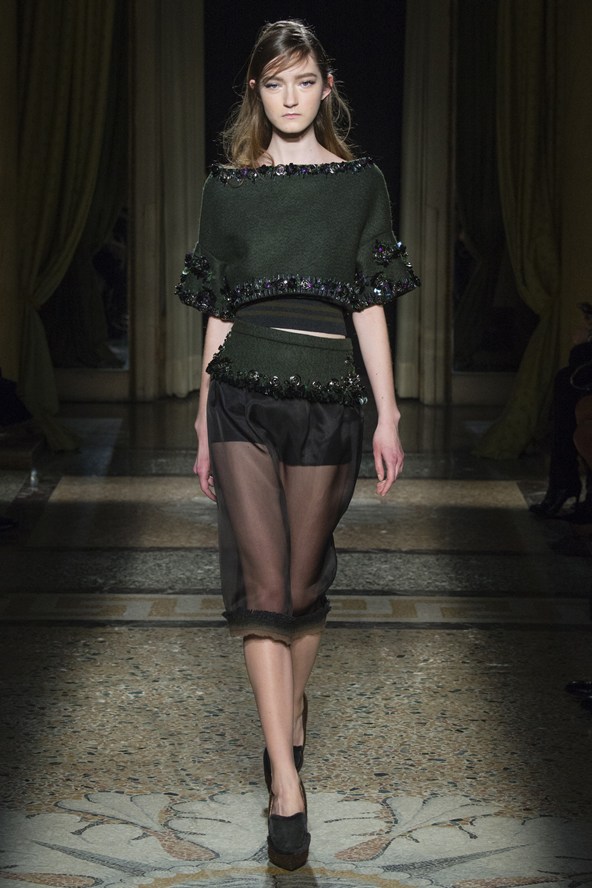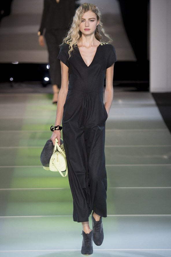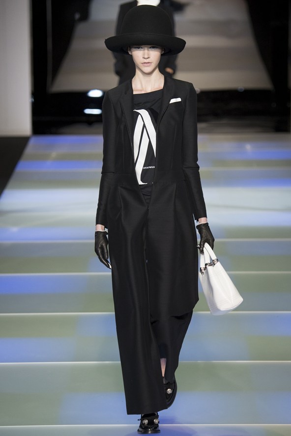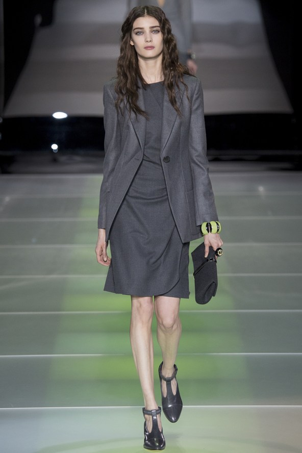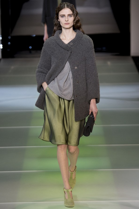 من جهته مزج جورجيو ارماني أقمشة لينة باللون الرمادي مع الأخضر لنظرة شبابية في مجموعة الخريف والشتاء .و عرض ارماني سراويل واسعة باللون الرمادي تصل إلى منتصف الساق أو إلى الكاحل وسراويل أخرى ضيقة بلمحة من اللون الأخضر وسراويل قصيرة سوداء واسعة تشبه التنورات. وارتدت العارضات سترات واسعة بنقوش تشبه جلود الزواحف يصل طولها إلى الخصر مع سراويل قصيرة واسعة وأحذية ذات رقاب طويلة.