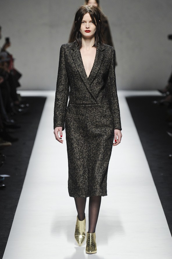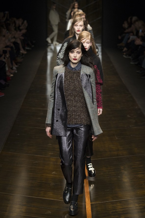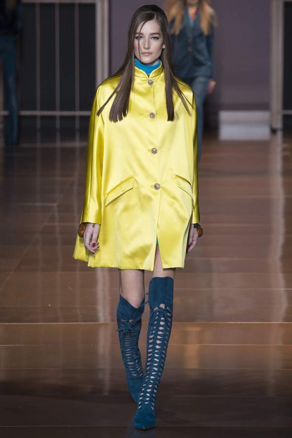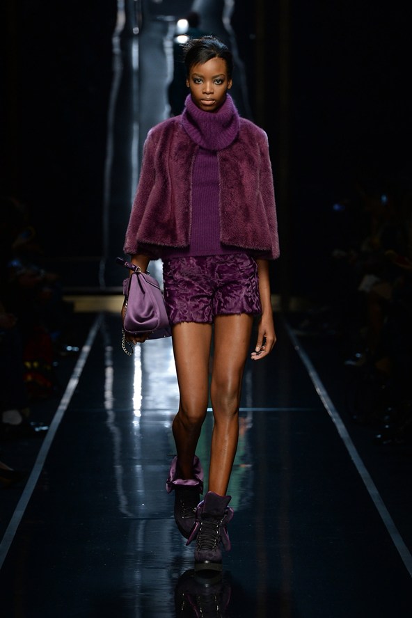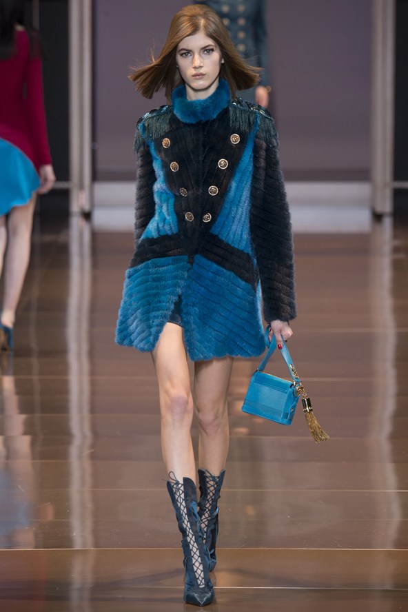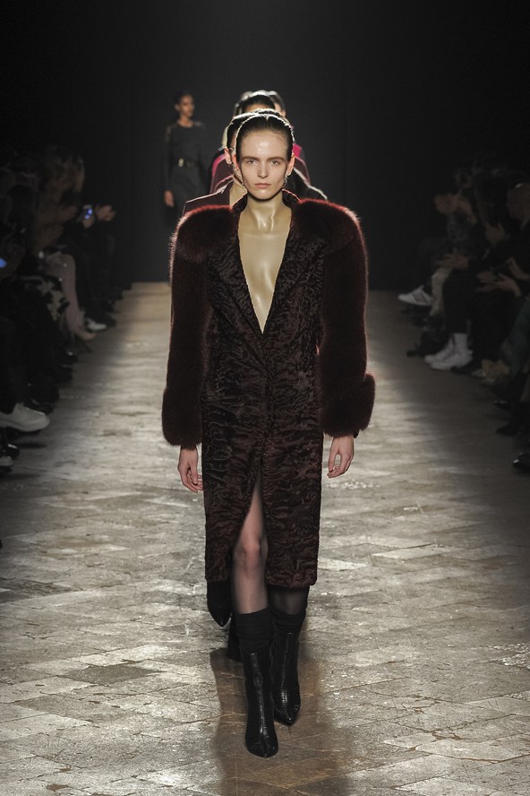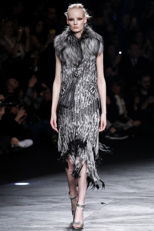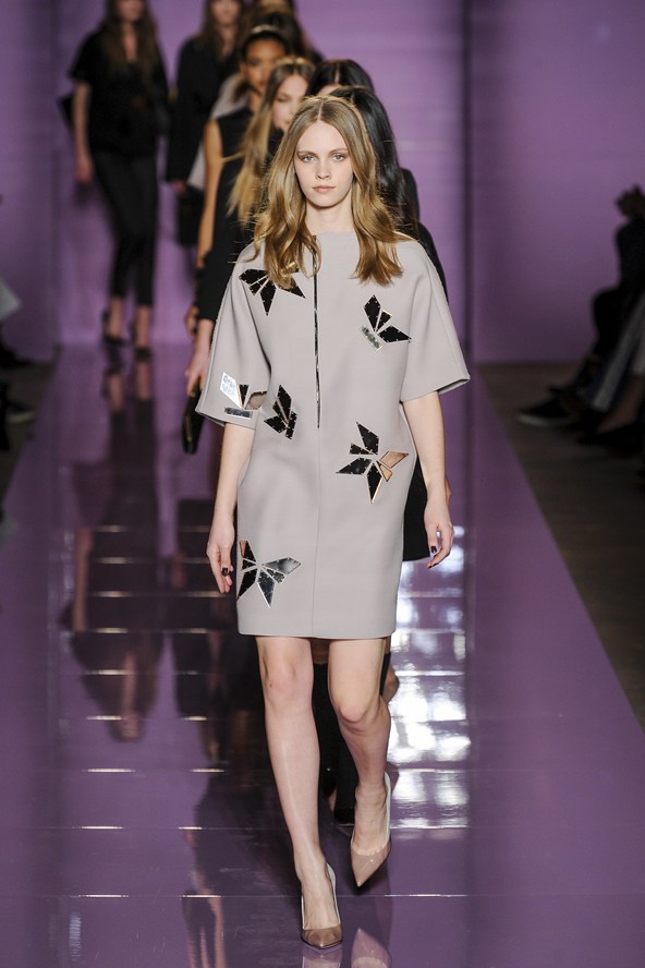 دوناتيلا فيرساتشي عادت بلمسة من عشرينيات القرن الماضي مع الفساتين القصيرة المزينة بالأحجار والدانتيل. أما المعاطف فظهرت بالفرو القصير ويغلب عليها اللون الأحمر الأرجواني. مع تدرج واضح للأزرق والأسود.
