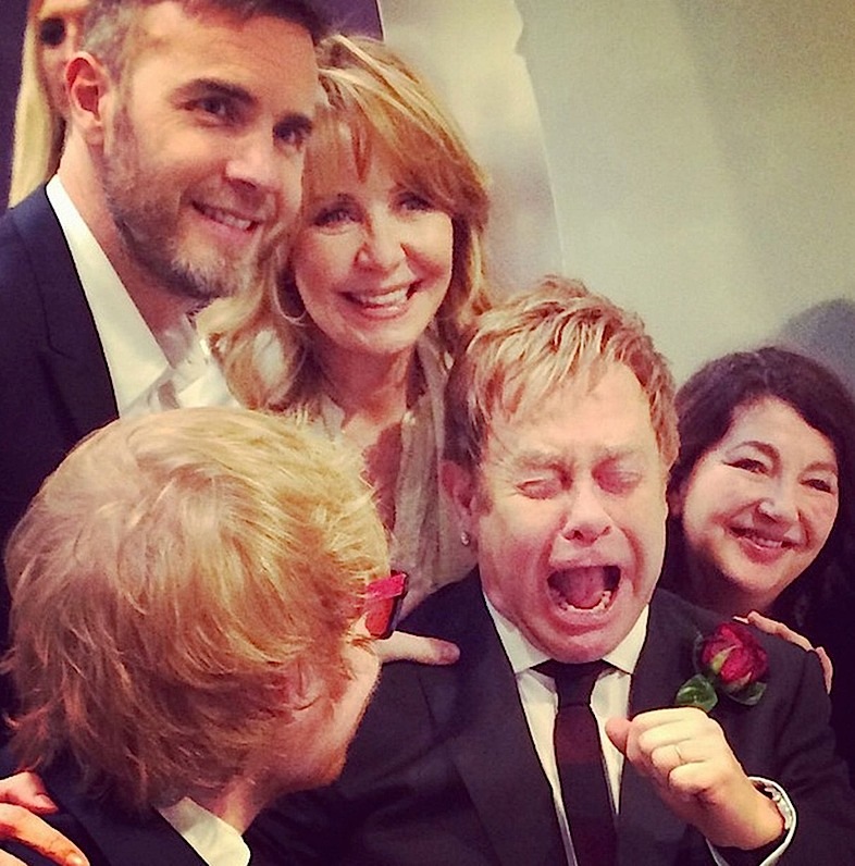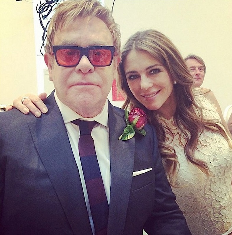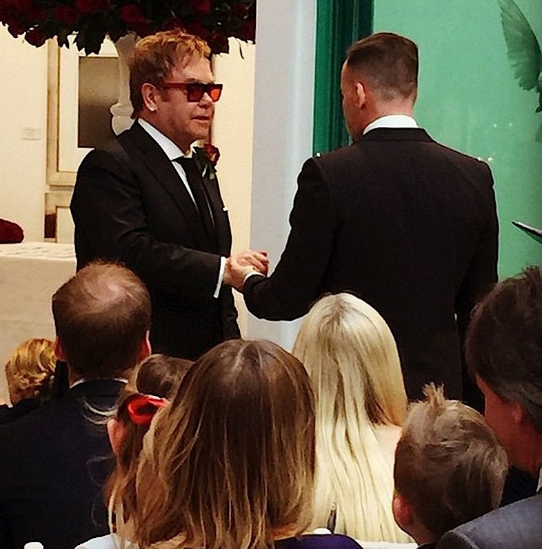 وقالت وسائل إعلام محلية إن الزفاف تم في منزل جون في ويندسور على بعد 40 كيلومترا غربي لندن. وأظهرت صور نشرها مشاهير آخرون على الانترنت حضور لاعب كرة القدم السابق ديفيد بيكهام وزوجته فيكتوريا بصحبة أولادهما الحفل.