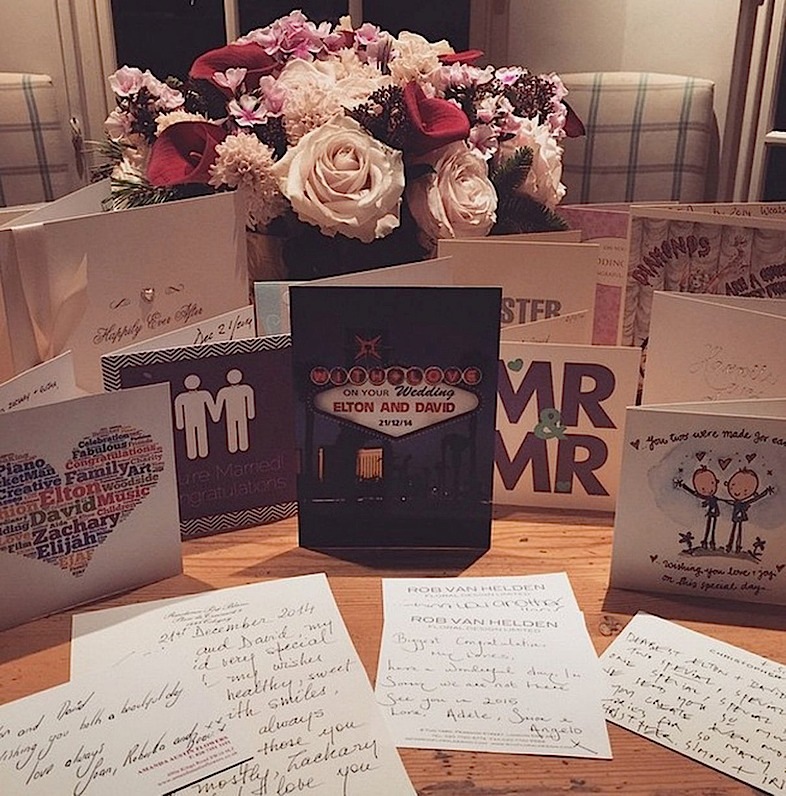 وكتب في الدعوة التي طبعت على خلفية مزينة بالزهور “يتشرف سير التون جون وديفيد فيرنيش بدعوتكم للاحتفال بزفافهما يوم الأحد 21 ديسمبر.” ونشر جون وفيرنيش فيما بعد صورا من الزفاف ومراسم الزواج وقائمة الطعام التي شملت اللحم وفطيرة البصل وكعكة الزفاف.