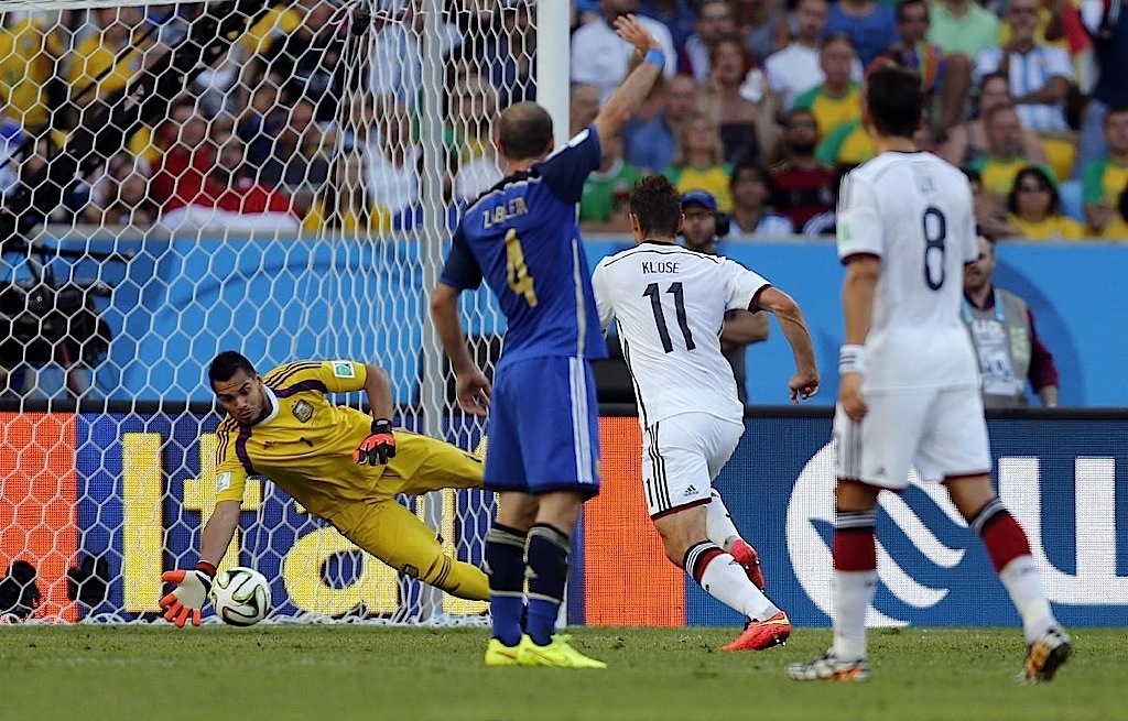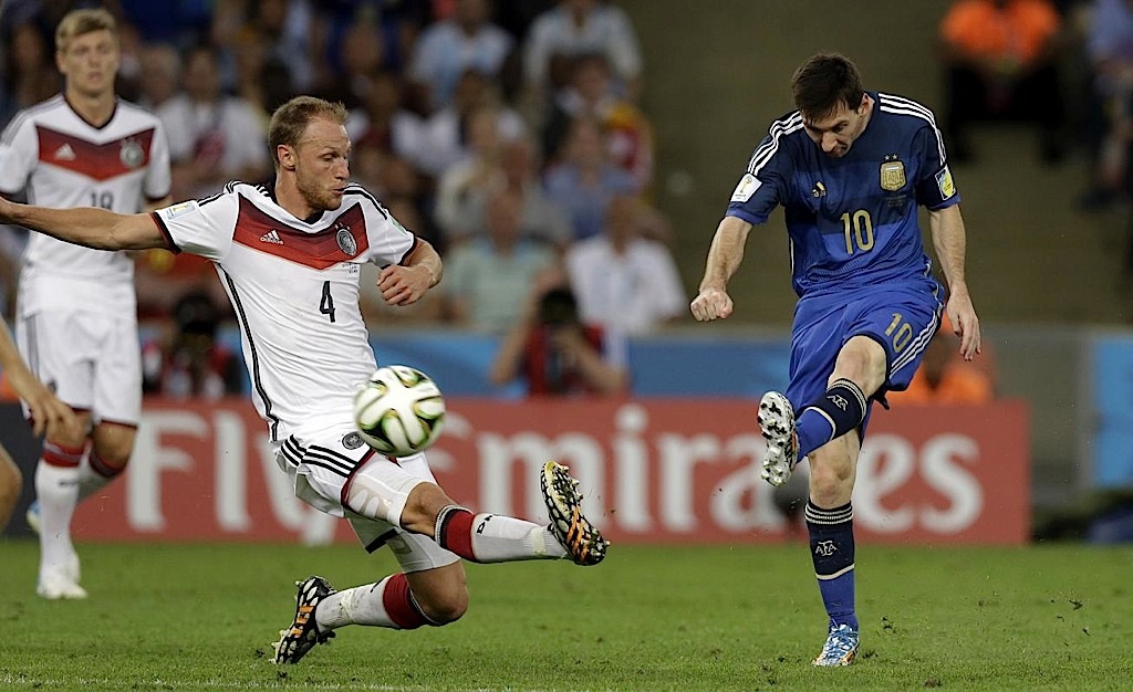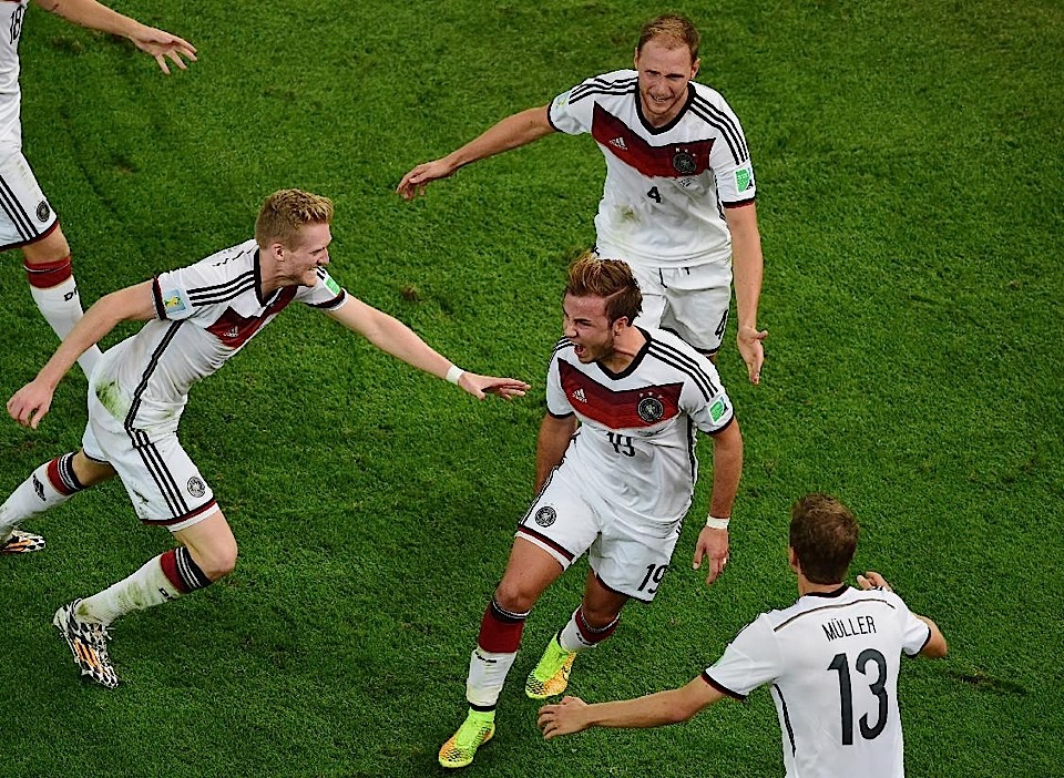 أحرز البديل ماريو غوتسه هدفا في الشوط الإضافي الثاني ليقود ألمانيا لإحراز لقب كأس العالم لكرة القدم للمرة الرابعة بالفوز 1-صفر على الأرجنتين في المباراة النهائية في ريو دي جانيرو . وحسم غوتسه الذي شارك قبل دقيقتين من نهاية الوقت الأصلي لبلاده اللقب الرابع في كأس العالم بعدما استلم بطريقة رائعة تمريرة عرضية من البديل اندريه شورله ليسكنها الشباك في الدقيقة 113.