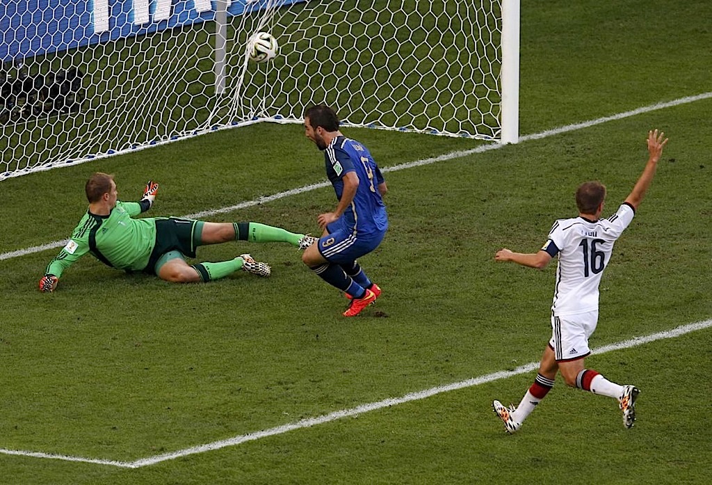 ورغم غياب الأهداف لفترة طويلة كانت الإثارة حاضرة طوال الوقت. وسجل جونزالو هيجوين هدفا للأرجنتين بعد تمريرة من ايزيكيل لافيتسي في الدقيقة 30 لكن الحكم ألغاه بداعي التسلل. وأظهرت الإعادة التلفزيونية صحة القرار. وقبل هذا الهدف الملغي أهدر هيجوين فرصة سهلة للتقدم بالهدف الأول للأرجنتين عندما انفرد بالحارس الألماني مانويل نوير وسدد الكرة خارج المرمى تماما في الدقيقة 21. وجاءت أخطر فرص ألمانيا في الثواني الأخيرة من الشوط الأول عندما ارتقى المدافع بينديكت هوفيديس لمقابلة ركلة ركنية ووضع الكرة برأسه من مدى قريب في القائم قبل أن ترتد لتوماس مولر وتحتسب تسلل.