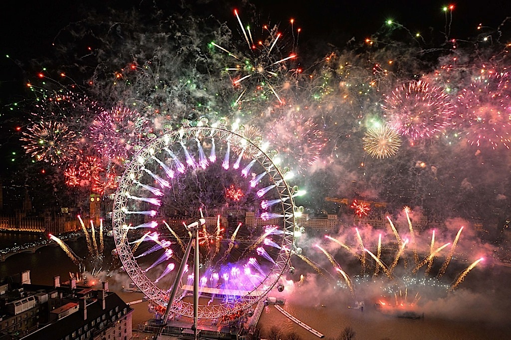 وفي لندن هبطت على الناس سحب من رذاذ بطعم الموز والفراولة في الوقت الذي لمعت فيه الالعاب في النارية السماء فوق نهر التيمز وبرج بيج بن وغيره من المعالم.
