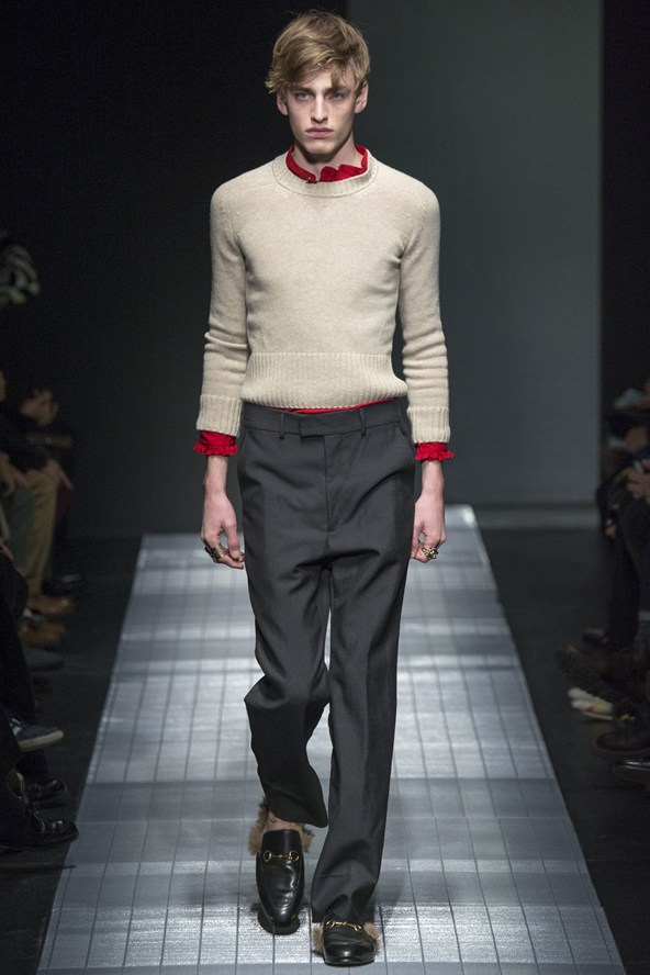 واختارت «ديرك بيكمبرغ» موديلات القمصان الثقيلة المزودة بغطاء الرأس وسحابات مفتوحة تظهر الصدر، لافتتاح اليوم الختامي لأسبوع الموضة في ميلان. وكان من ضمن الموديلات التي قدمتها الدار قمصان رمادية من الكشمير مزينة بخطوط قُطرية ذات لون وردي فوق بناطيل «ليجينز» وردية وسوداء وذلك لموسم خريف-شتاء المقبل.
