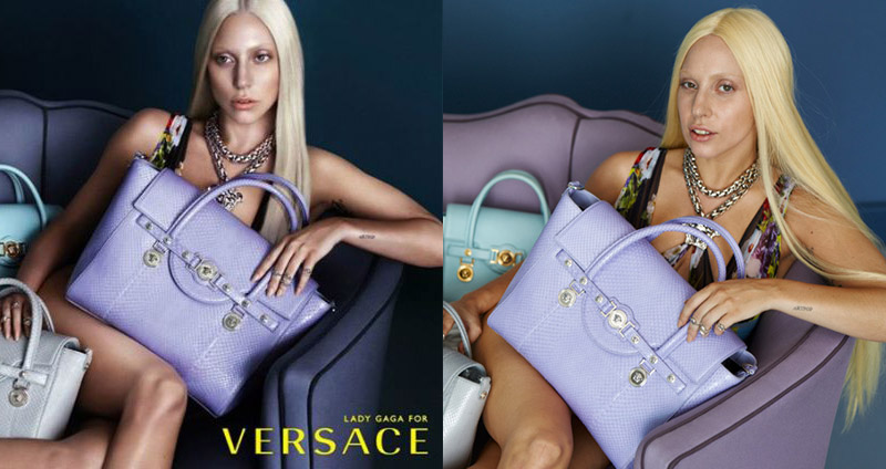 قبل عام قامت المغنية ليدي غاغا بتصوير اعلان لدار الأزياء Versace بحيث بدت أنيقة ورائعة. لكن الحقيقة تجد دوما طريقها للجمهور، اذ تم تسريب صور جلسة التصوير قبل تعديلها من خلال برنامج فوتوشوب. ورغم انه من المعروف ان جميع النجوم وجميع الاعلانات تخضع لروتوش الفوتوشوب لكن ما تم القيام به مع غاغا خلال الاعلان هذا هو عملية «نفض» كاملة وشاملة . اذ وخلافا للصور التي نشرت العام الفائت بدت غاغا شاحبة وخالية من اي جاذبية او بريق والبقع تظهر بوضوح على وجهها وعلى ساقيها. وهذه ليست المرة الاولى التي يتم اتهام غاغا باعتماد الفوتوشوب «الثقيل» اذ تم اتهامها بتعديل شامل لشكلها في الصور التي نشرت على غلاف مجلة فوغ.