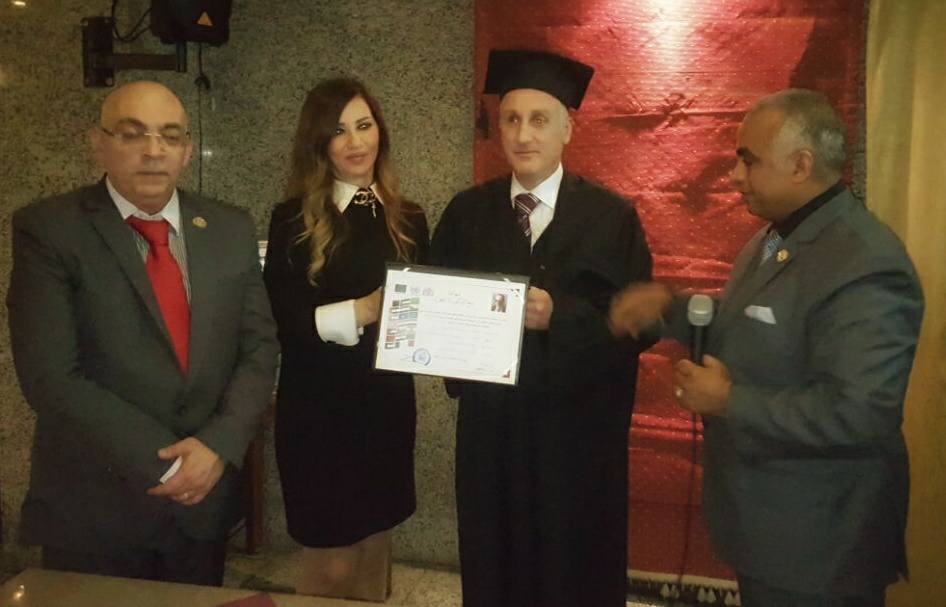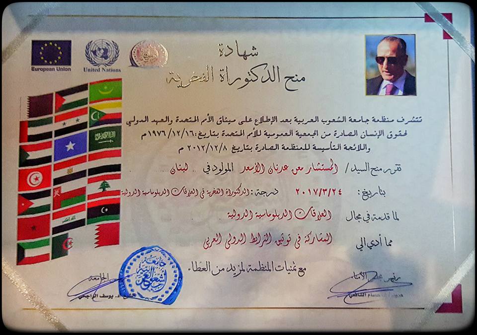 قررت منظمة جامعة الشعوب العربية بعد الإطلاع على ميثاق الامم المتحدة والعهد الدولي لحقوق الانسان الصادرة عن الجمعية العمومية للامم المتحدة منح السيد المستشار معن عدنان الاسعد درجة الدكتوراة الفخرية في العلاقات الدبلوماسية الدولية لما قدمه في مجال العلاقات الدبلوماسية الدولية .