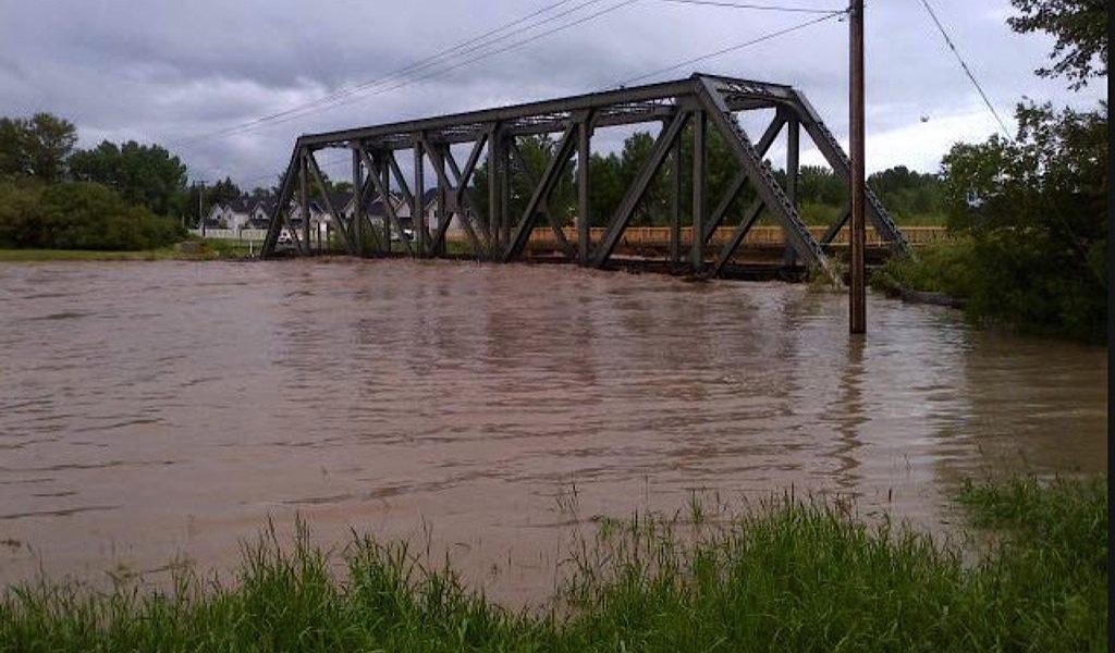 خرجت خمس من عربات السكك الحديدية تحمل منتجات بترولية خطيرة عن مسارها فوق جسر محطم أعلى نهر باو الذي تغمره مياه الفيضانات في كالجاري باقليم البرتا الكندي.