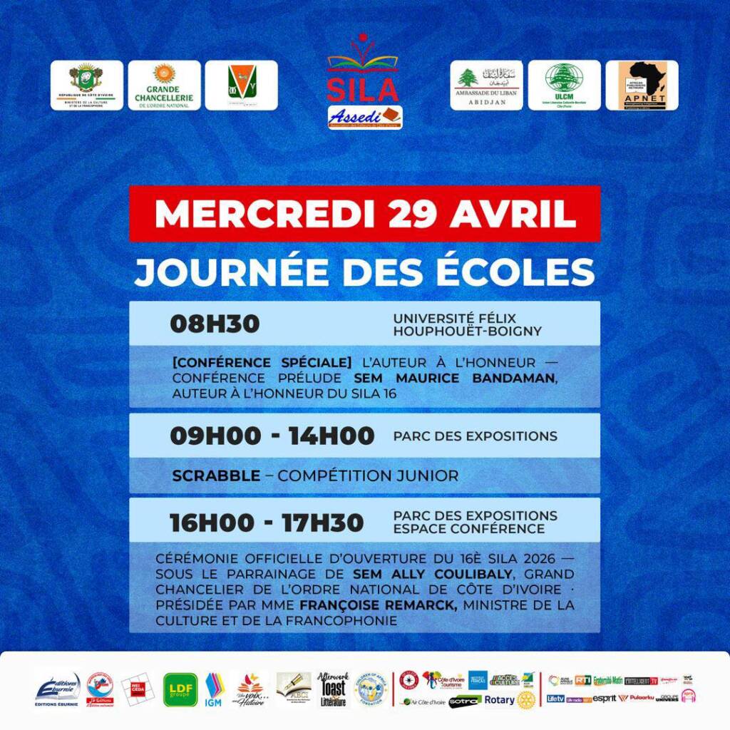 يوم المدارس يبدأ اليوم في الثامنة والنصف صباحاً بمحاضرة خاصة في جامعة فيليكس هوفويت-بواني يُلقيها الكاتب المكرّم موريس باندامان. ومن التاسعة حتى الثانية عشرة ظهراً، تنطلق مسابقة الكلمات المتقاطعة للناشئين في قاعة المعرض. ويختتم اليوم بحفل الافتتاح الرسمي للدورة بين الرابعة والخامسة والنصف مساءً.